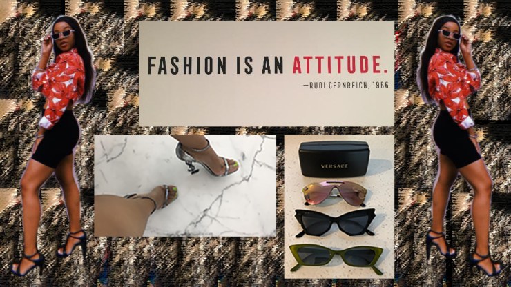 The photo collage that I’ve created consists of myself, a pair of YSL heels, a dress designed by a student at the Fashion Institute of Design and Merchandising (background), Versace and forever 21 sunglasses and a quote that states, “ Fashion is an attitude” by Rudi Gernreich. While on the Study Away Los Angeles, California Tour that Kent State University’s fashion school provides, we had the opportunity to visit many high fashion stores and connect with the brand ambassadors. This is where most of my pictures and inspiration came from.